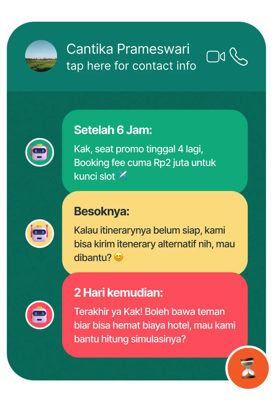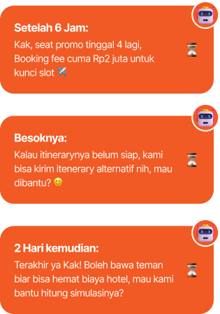 Optimalkan list Anda dengan follow-up otomatis! Kirim pesan lanjutan beberapa jam atau hari setelah calon pembeli chat pertama kali.